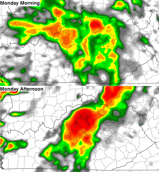 The storms for Monday look to be a bit more prominent and that shows up well on the high res NAM simulated radar…