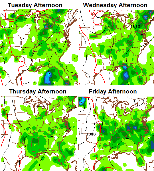 The models continue to insist rounds of showers and storms will be common over the next 10 days…