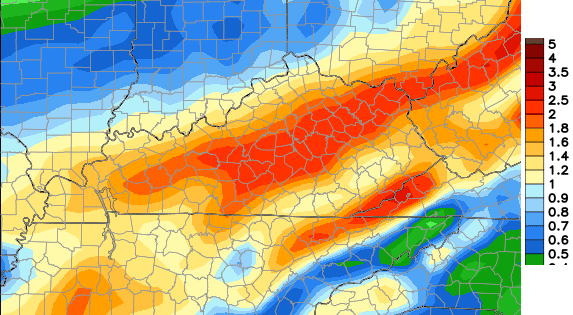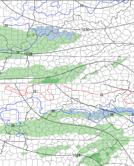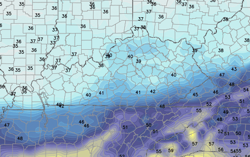 A wave of low pressure will work northeastward along our stalled out front. That will bring a surge of milder air into the southeastern corner of the state. Temps in this region may hit 60 while areas of western and northern Kentucky stay in the upper 30s and low 40s.