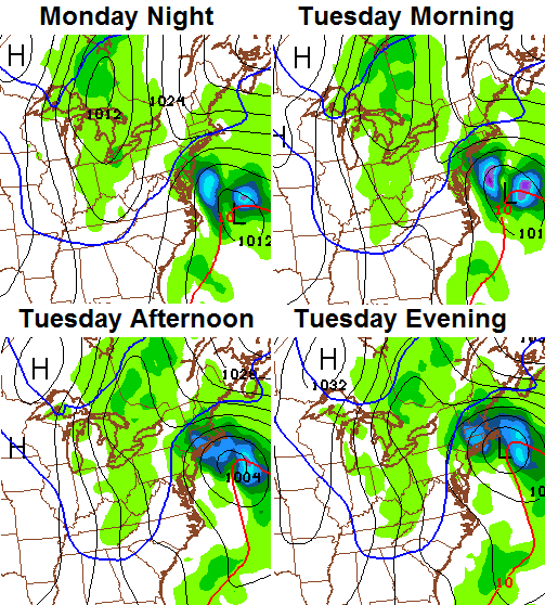 If it plays out like that, light snow would be possible as it passes over our heads and wraparound snow showers and flurries would be possible into Tuesday and Wednesday. The greatest chances would be in the central and east.