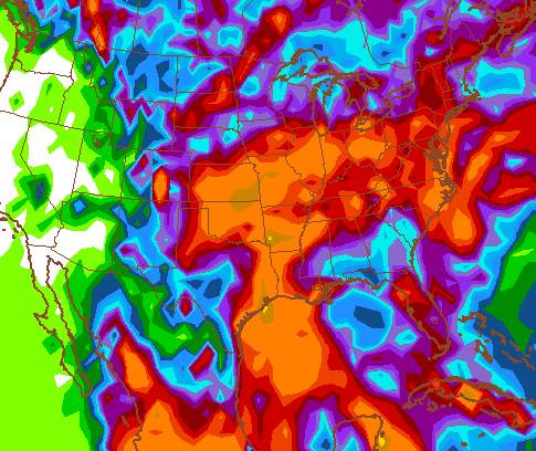 The GFS rainfall forecast shows a similar path of tropical moisture…