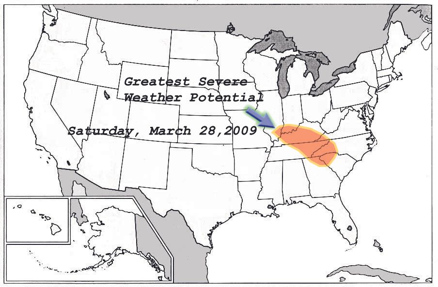 Perhaps I should post a map of where I think the highest threat for severe weather exists today…….