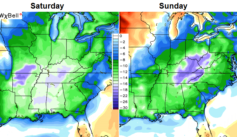 Temps moderate into the first half of the week as our skies stay mainly dry. All of that looks to change by the end of the week as another cold front approaches from the northwest. This bad boy may hang out around here into next weekend with soggy weather leading to another decent cooldown…