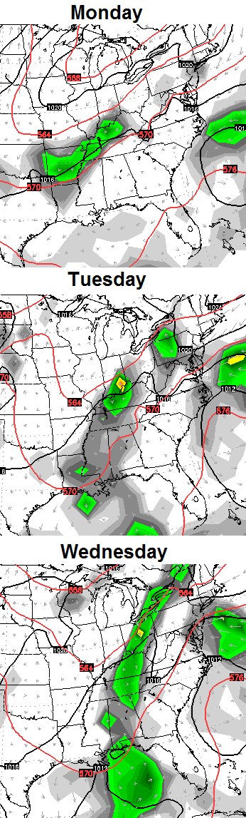 The European Model is back to showing what the GFS had been showing up until a few days ago, and that’s a stalled front with waves of showers and storms developing along it. The model goes about it a little differently with a “baggy” trough developing across our region and into the southeast…