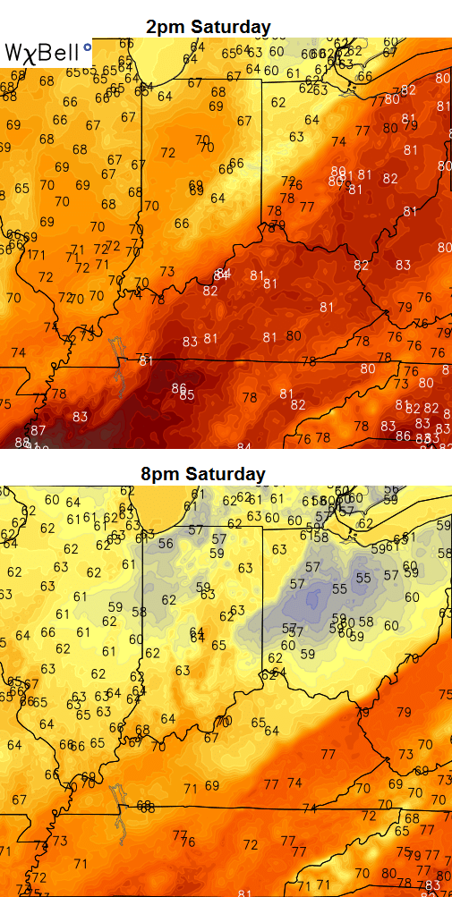 Winds will be very gusty as the front moves through and our temps should drop pretty quickly. You can see just how quickly on the same model run…