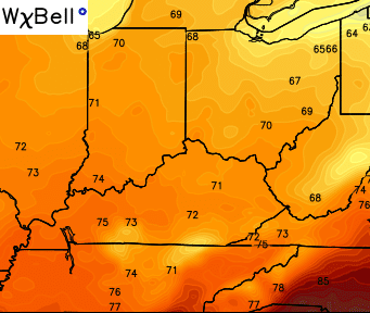 Monday morning temps will drop into the upper 40s for many with afternoon temps in the low and middle 70s. Moisture will increase to our south and I can’t rule out a stray shower or storm.