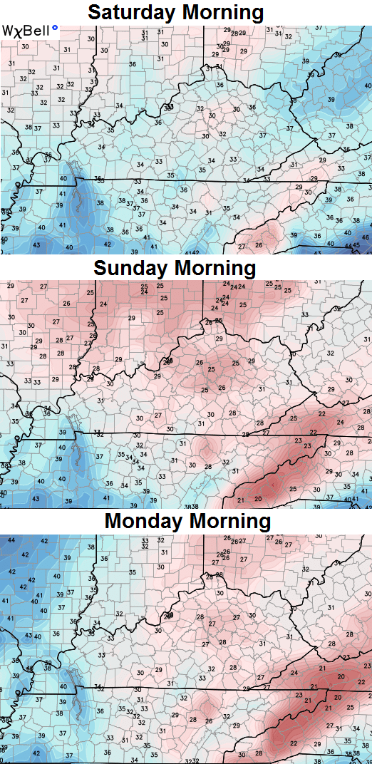 This air is coming in behind a cold front sweeping to our east and southeast today. Winds will be very gusty as the colder air moves in. Readings this weekend will be on the cold side with frost and freezing conditions likely. The latest computer model forecast for lows…