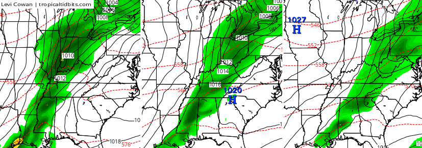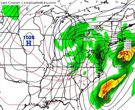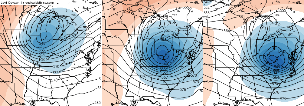 The models are getting very, very close to showing a big system across the east next week. The Canadian Model is leading the way with other models trending toward it. Check out how this system deepens on top of us…
