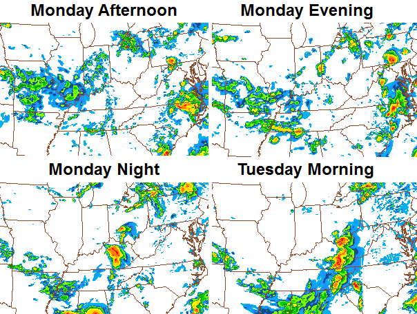 The model then shows additional showers and storms blowing up farther eastward as we start out the new week…
