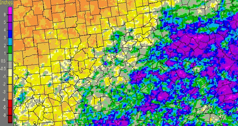 The past three weeks of severe storms have been tough on a lot of folks.These boomers do have a good side and that comes in the amount of rain they have dropped across much of the state. The central and eastern parts of Kentucky have had the drought conditions basically wiped out. Take a look at how much above normal the July rains have been…