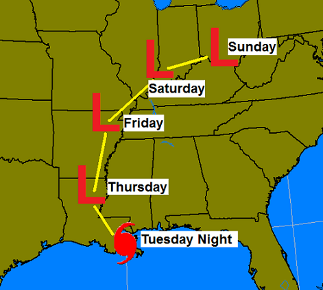 This Hurricane is weak. I doubt we will get any rain from it. Everyday all the models move the low further to the west. Omaha has a better chance of receiving rain than the folks east of I-65. Hope I am wrong but I do not like the trends. Issac has already been down graded to a cat 1 when it hits somewhere in La.