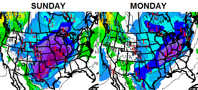 That’s some big time cold air invading much of the country. Notice how the second front Saturday into Sunday slows down as low pressure develops along it. That low works from Texas into the eastern Great Lakes and that’s a late fall or early winter storm track. That may even have a swath of snow on the far northern edge of it. Speaking of snow… you are going to be hearing a lot about it over the next few weeks as the flakes fly early for many areas of the country. The GFS Ensembles for early Sunday looks the part…
