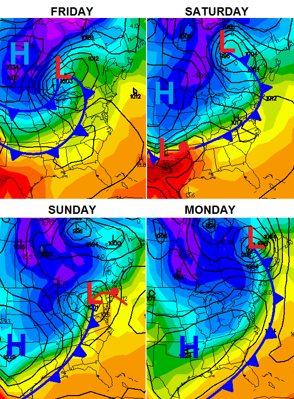 Cooler winds will blow on Wednesday as the low pulls off to our north. Thursday looks like the best weather day we see for a while with highs in the 70s and partly sunny skies.