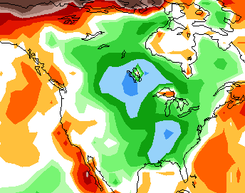 The big red blob shows where the highest heights are located and that’s a gorgeous sight for cold and snow lovers in the eastern half of the country. That forces the jet stream to take a big dip allowing cold air to move in from Canada…