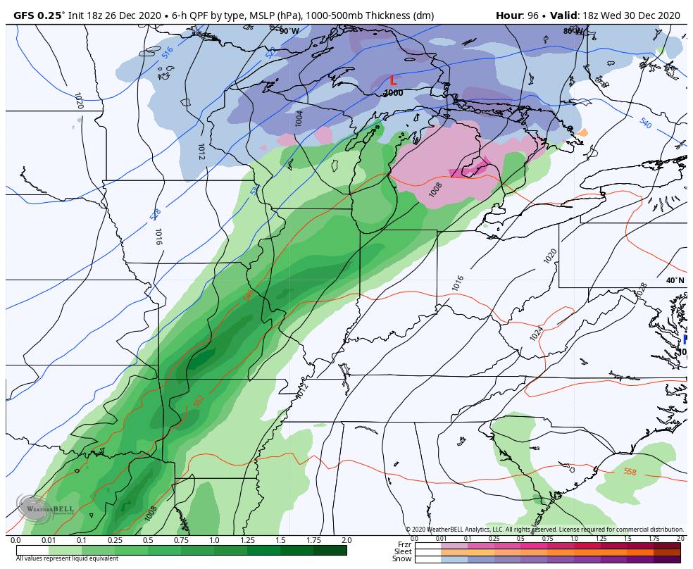 The main item of interest in the week ahead is the New Year’s Eve/Day storm system. One low works into the Great Lakes and pulls a cold front in here. Low pressure develops somewhere along this boundary and that could bring some wild weather with it.