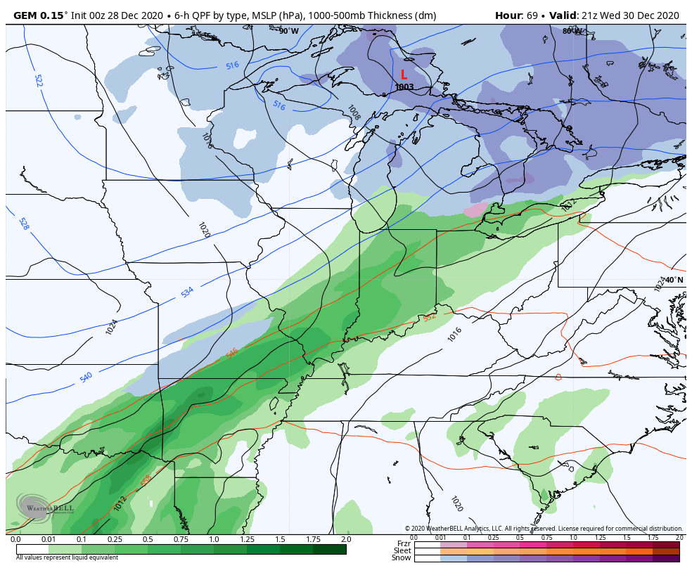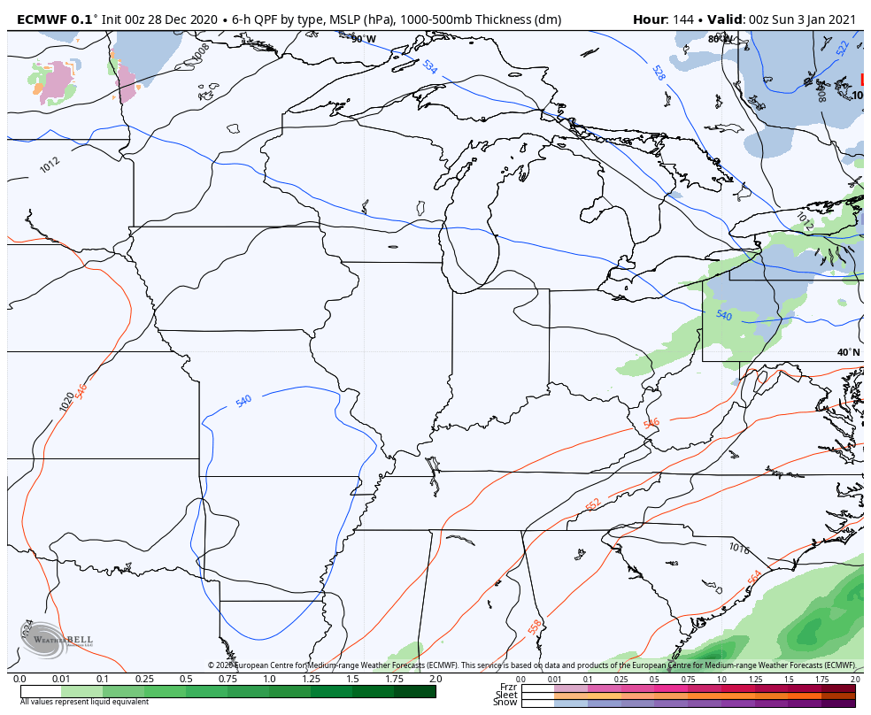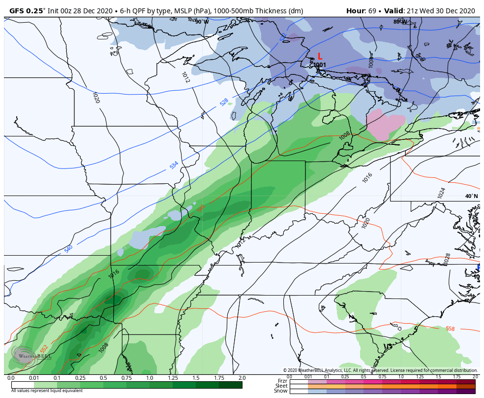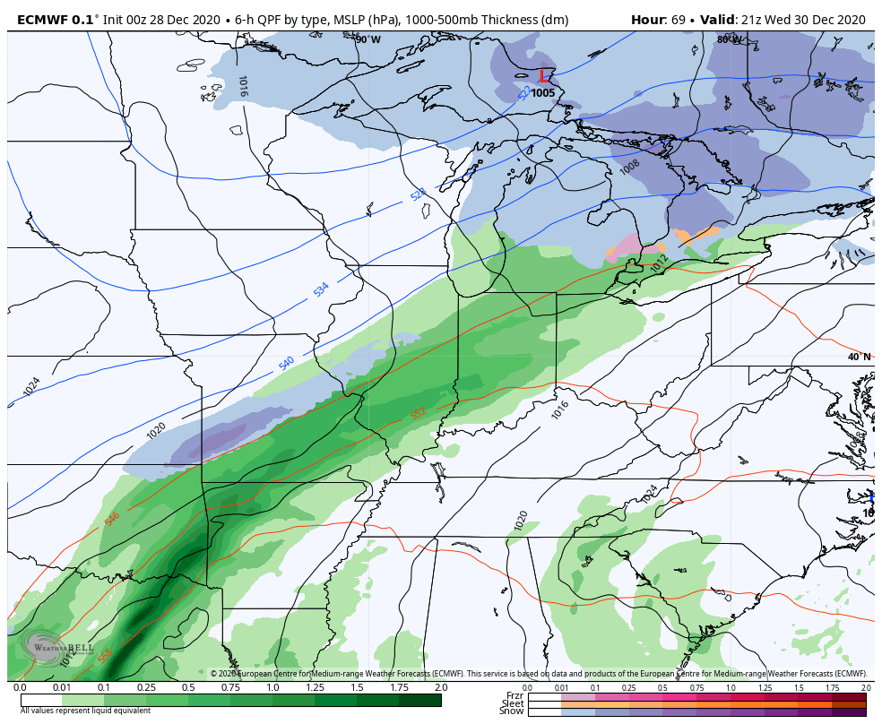 As this happens, a stronger storm develops across the southern Mississippi Valley and lifts to the north and northeast on New Year’s Day. What happens with this system will be dictated by just how far south the New Year’s Eve front can get. The farther south that front gets, the better opportunity for freezing rain to show up somewhere across the region. If that initial front doesn’t drop south of the Ohio River, then it’s nothing but heavy rain and thunderstorms.