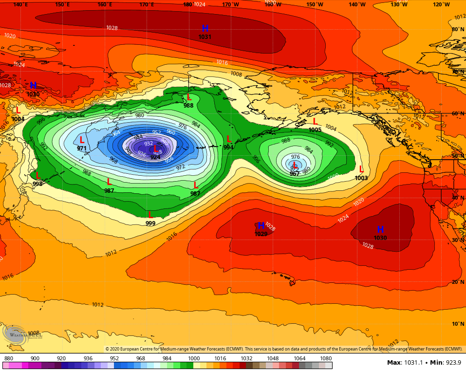 At the same time, the EURO is forecasting one of the lowest non tropical barometric pressures ever recorded near the Aleutian Islands…