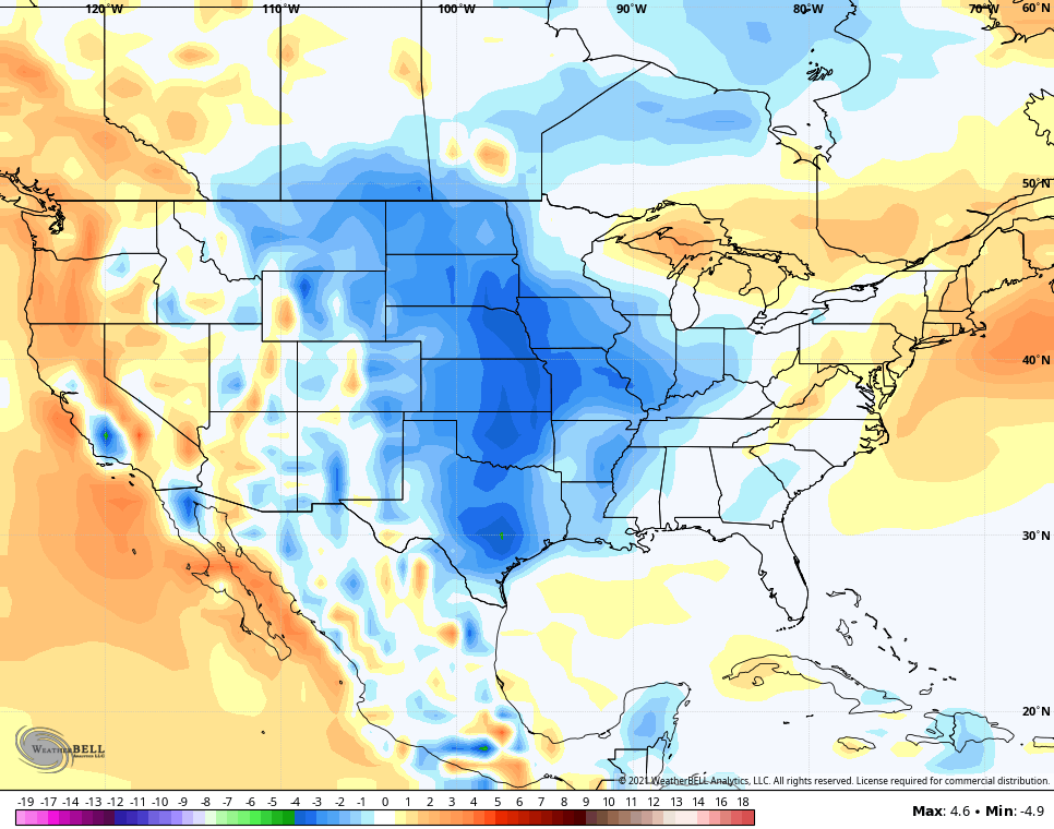 Notice how that leaves behind a piece of the trough all the way into the upcoming weekend. This keeps our temps in the well below normal category during this time and may also spawn a few showers and storms, especially across the eastern half of the state…