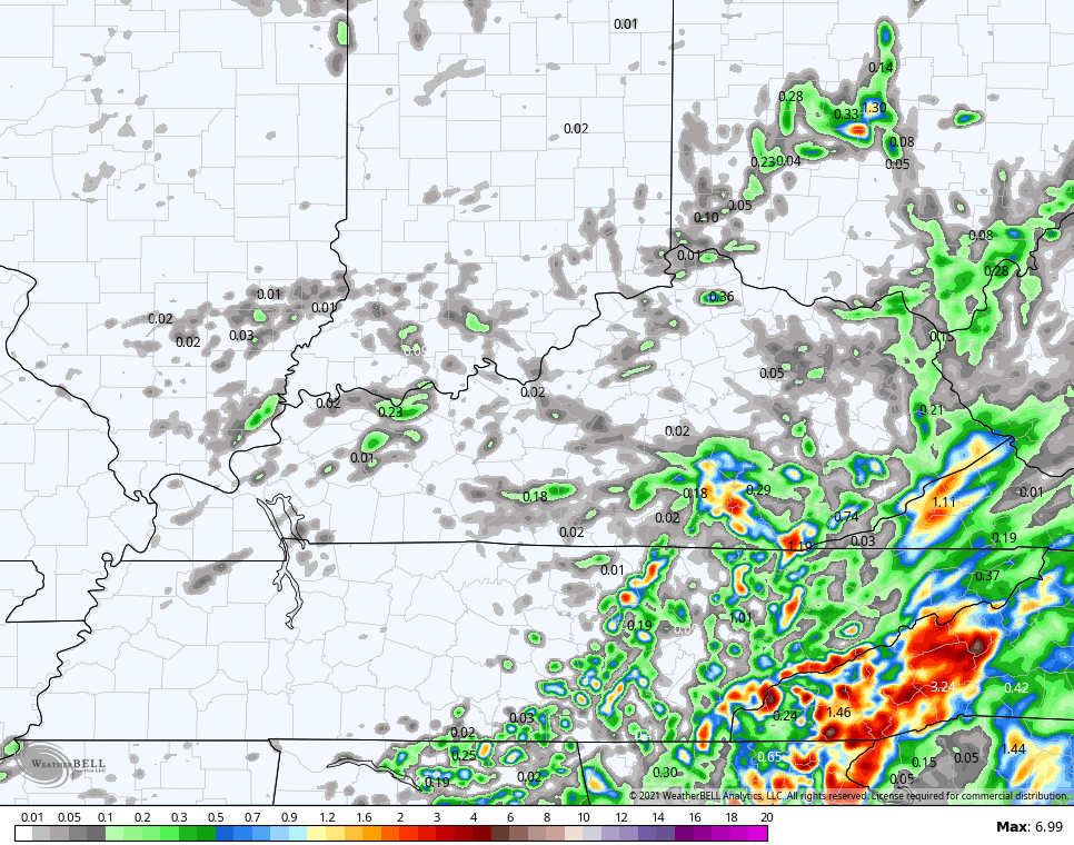 The threat for a few showers and storms then works a little bit to the west into Wednesday and that shows up on the models. Here are the rain numbers through Wednesday…