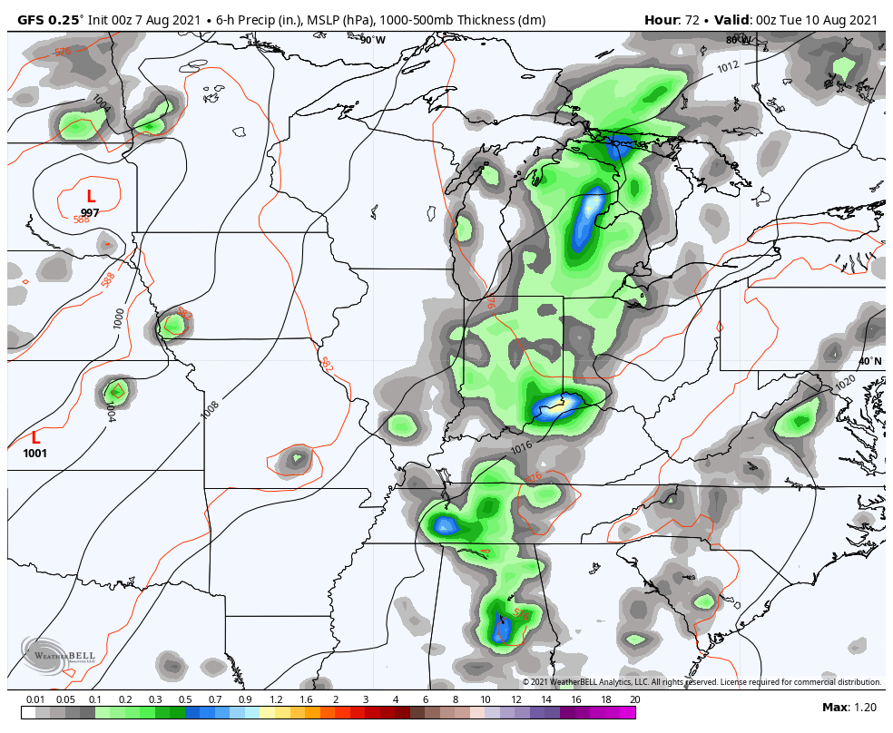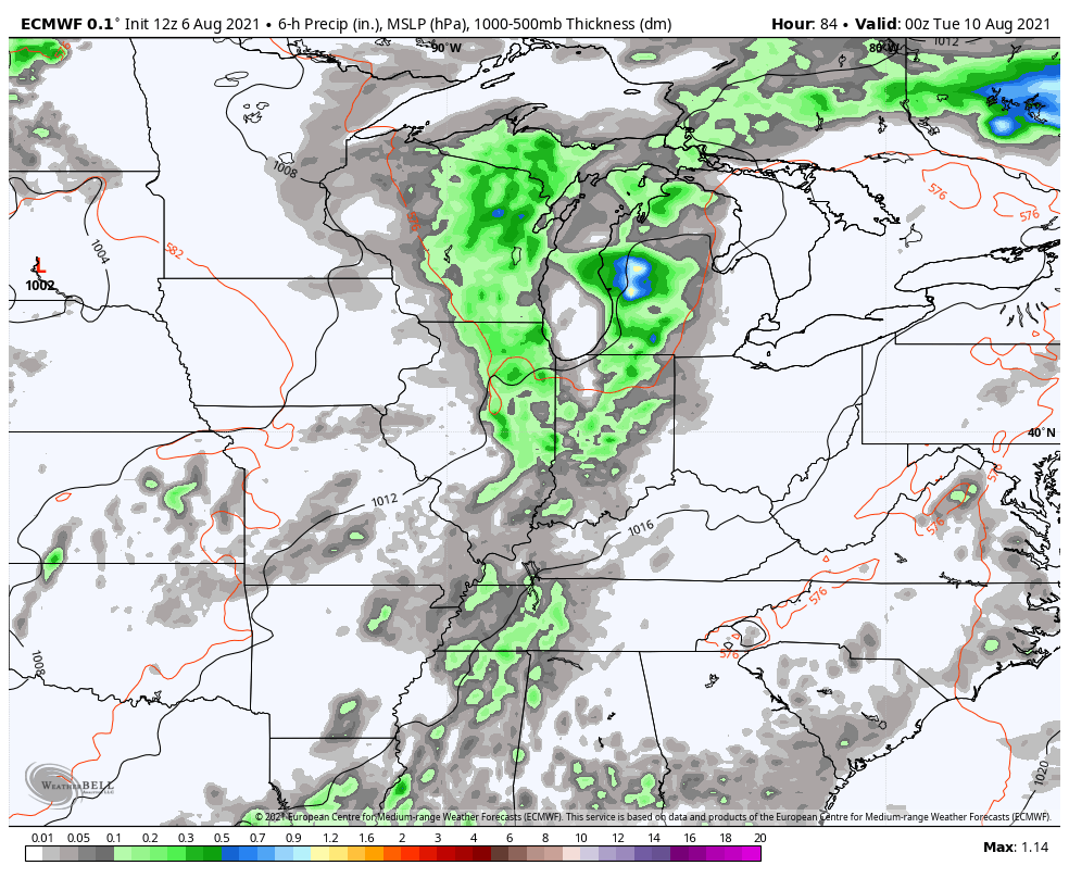 Storm chances come down a bit Sunday as temps climb a little more, making it feel like… August. The same can be said for Monday as storm chances start to ramp back up, especially across the west. This kicks off a pattern with rounds of showers and storms working through the region with a little more action ahead of a late week cold front. There is good agreement on this from the models…