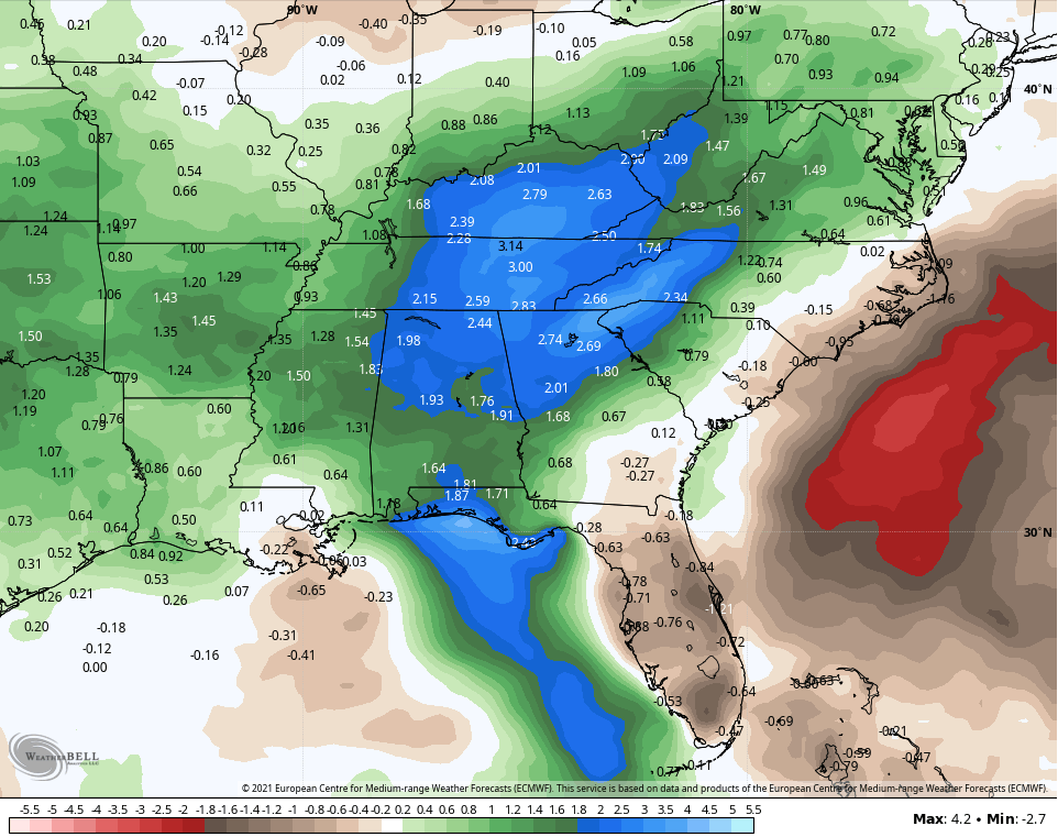Overall, this is a wet setup across the lower Ohio Valley into the Tennessee Valley over the next few weeks. The EURO Ensembles show the core of above normal rainfall on top of these areas…