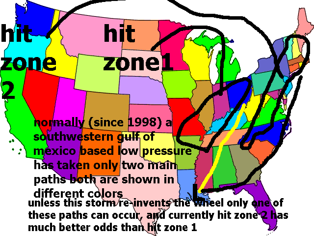 this map is sorta just how i see things. my personal opinoin and view of the past 13 years or so this is how low pressure has formed and tracked from the southwestern gulf region. for now clearly only one of these tracks makes sense for now, but to think suddenly a new middle track would form is hard for me to believe.