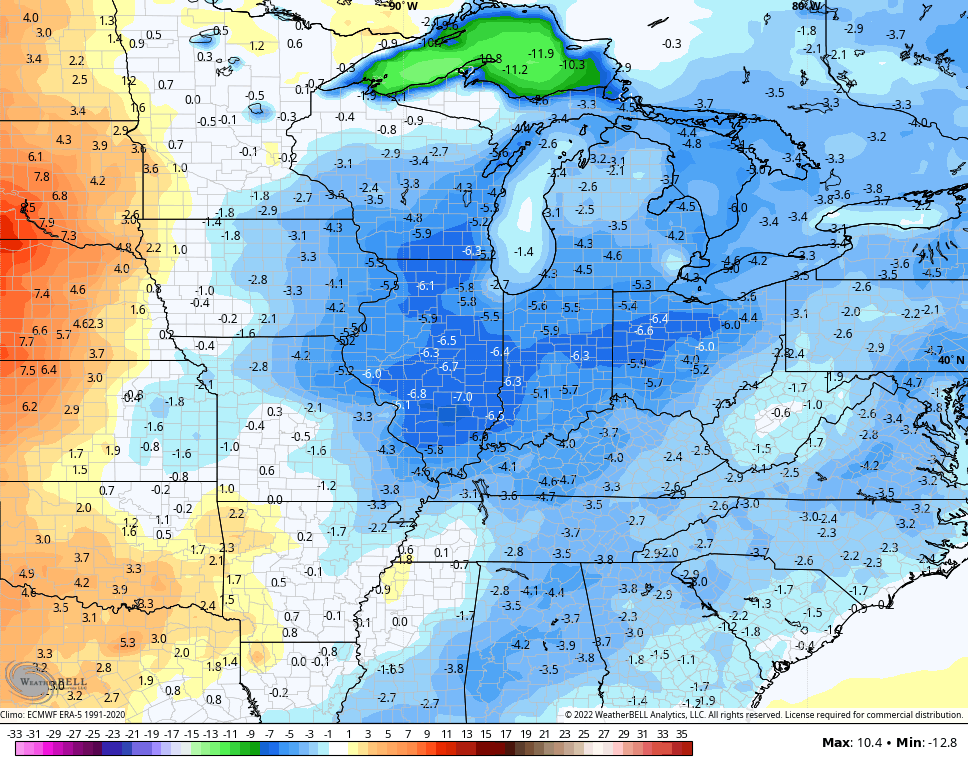Temps come way down behind that and might actually be pleasant for much of the middle and end of next week. Look at the 5 day temp departures behind the front…