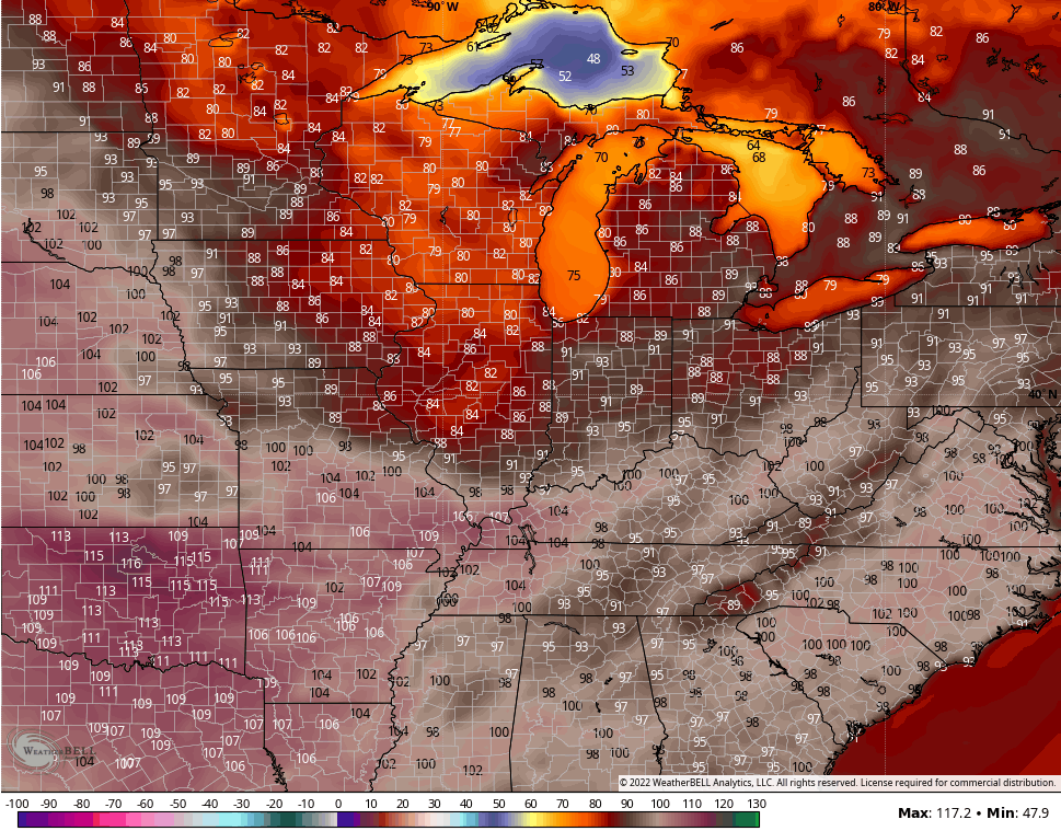 That system now looks to zip through quicker and that leaves an opening for the plains heat to shoot in here for the middle of next week. All the models have really been ridiculously too hot with the medium range forecast numbers, but it’s worth noting the GFS is up there for Wednesday…