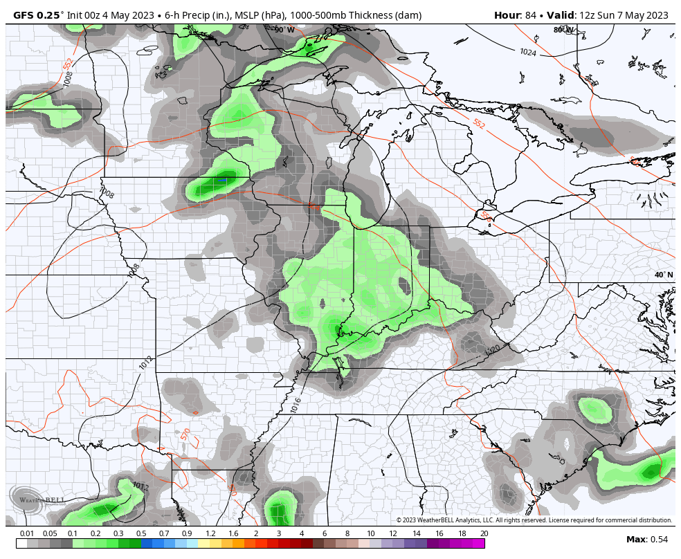 The system coming in for Kentucky Oaks Day Friday continues to mostly target western and southern Kentucky with a fairly sharp cutoff on the northern edge of the shower and thunderstorm shield.