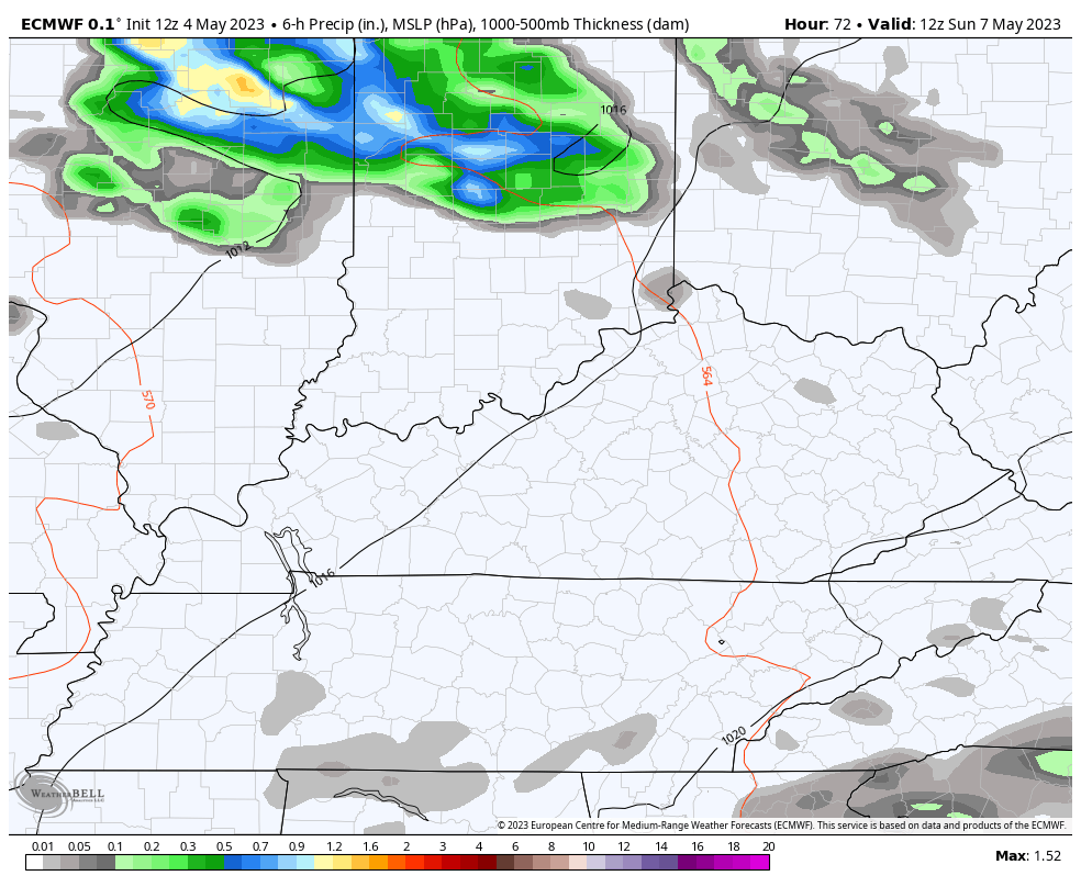 Even warmer and more humid air pushes in for Sunday and takes us into early next week. This may feature some rounds of storms dropping in here from the northwest. The EURO has been showing this for a few days now…