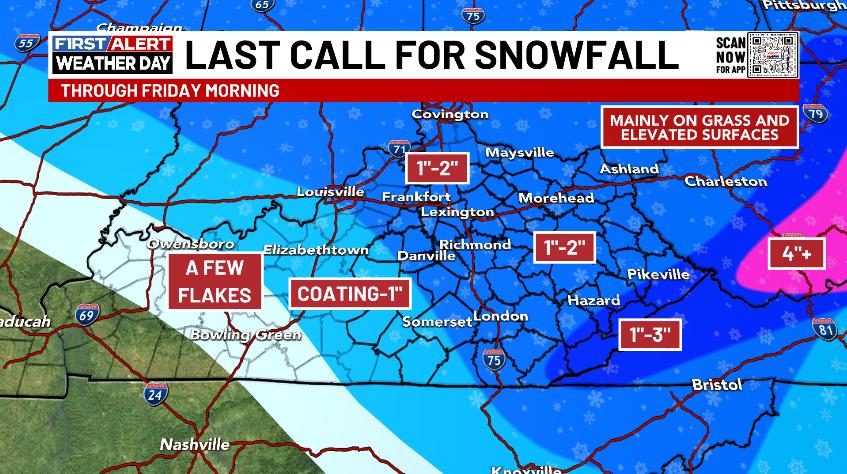 Slushy accumulations of coatings to an inch or two will be noted on the grass and elevated surfaces with a little more into far southeastern Kentucky…