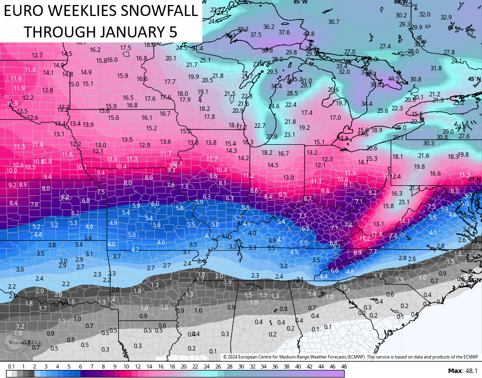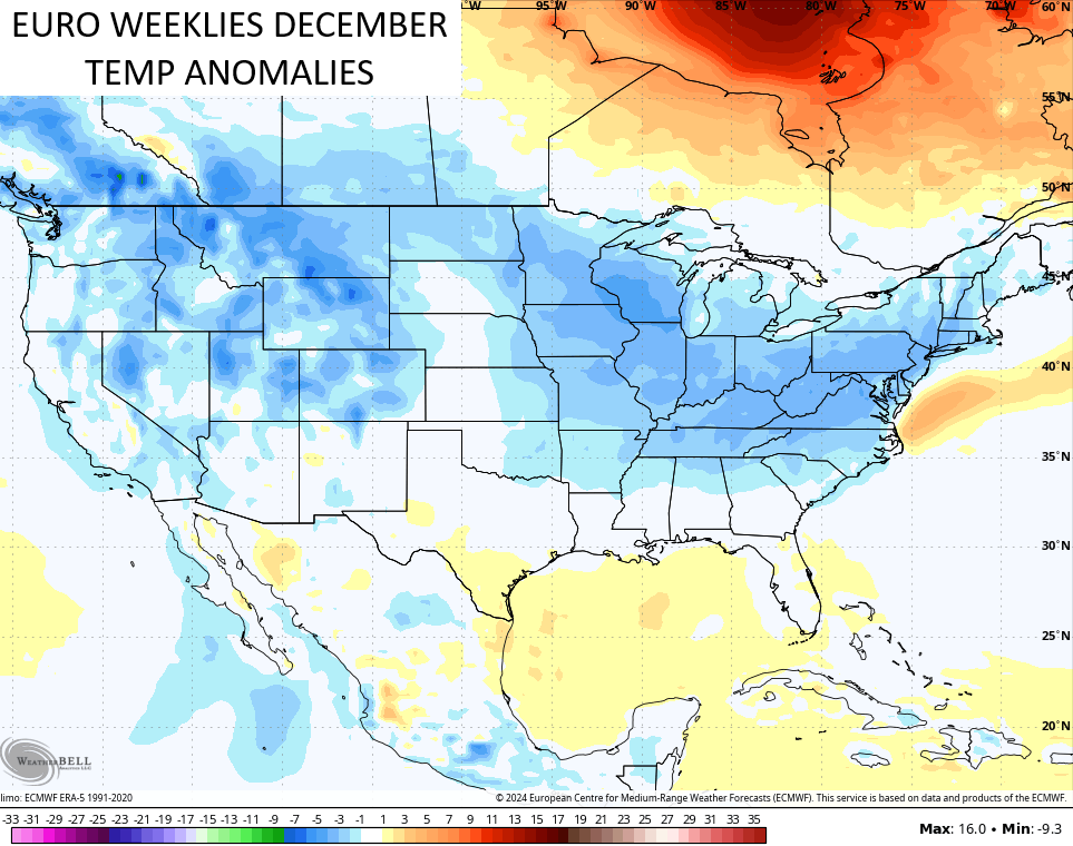 The EURO Weeklies have been giving us a signal for a colder pattern over the past week, but the latest run is now REALLY catching on. Look at the average of about 100 members in showing the temperature departures from normal for December…