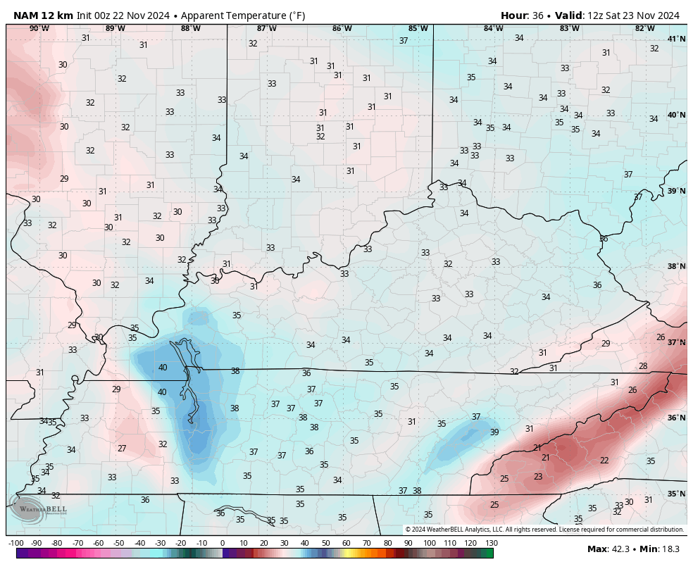 Temps this afternoon reach the upper 30s to near 40 for central and eastern Kentucky with 40-45 in the west. Winds will continue to be gusty, making it feel much colder.