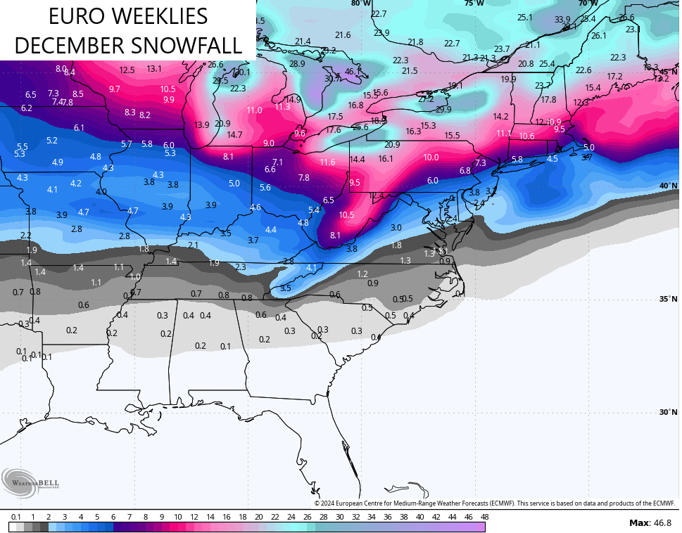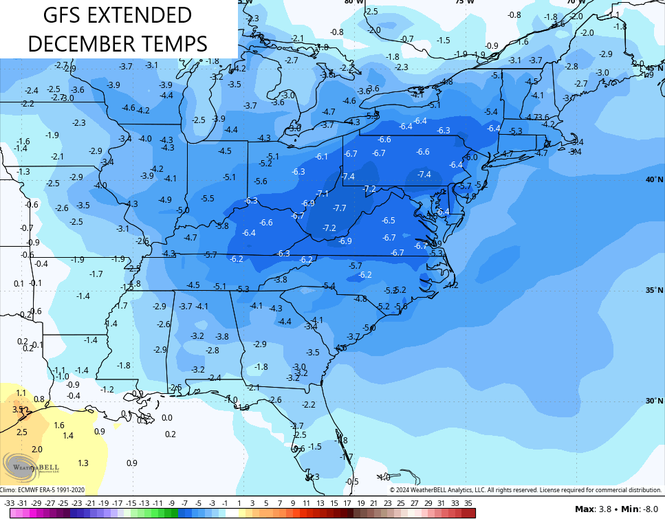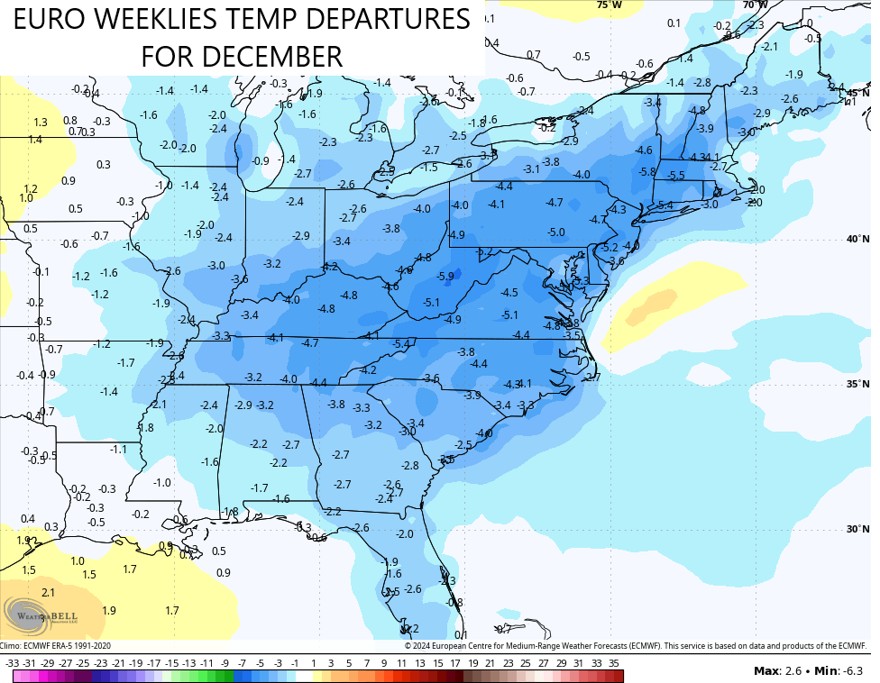 Looking at the month of December as a whole, we find the two most prominent extended models singing a similar tune. Both the GFS Extended and EURO Weeklies now have the month averaging colder than normal for our region and much of the eastern half of the country…