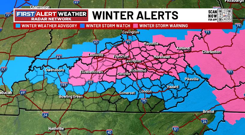 A Winter Storm Warning is out for much of central and eastern Kentucky through Tuesday evening. Winter Weather Advisories bracket this to the north and the south…