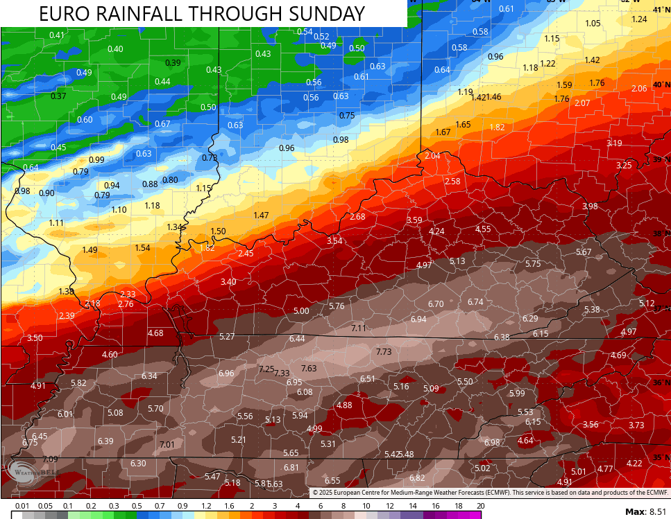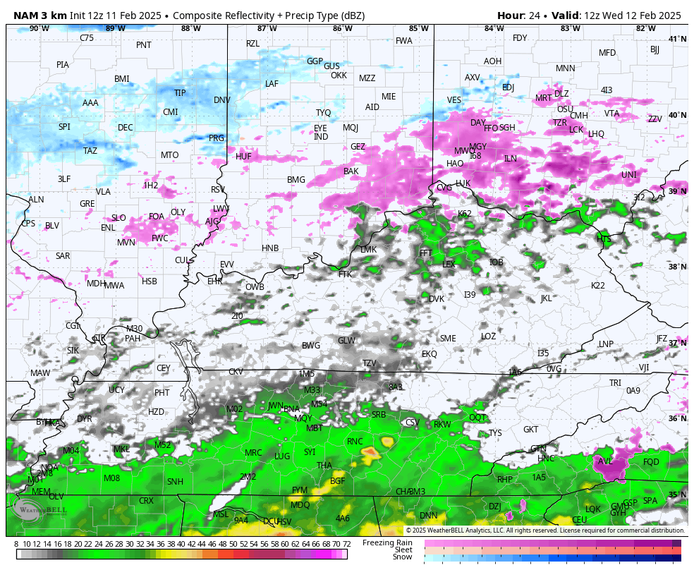 Some light freezing rain or freezing drizzle will be noted later tonight across the northern half of the state ahead of the next system. This brings an increase in temps and rain for Wednesday with heavy rain showing up during the afternoon and evening hours across central and eastern Kentucky. Here’s the future radar from the Hi Res NAM showing all this from 7am Wednesday to 7am Thursday…