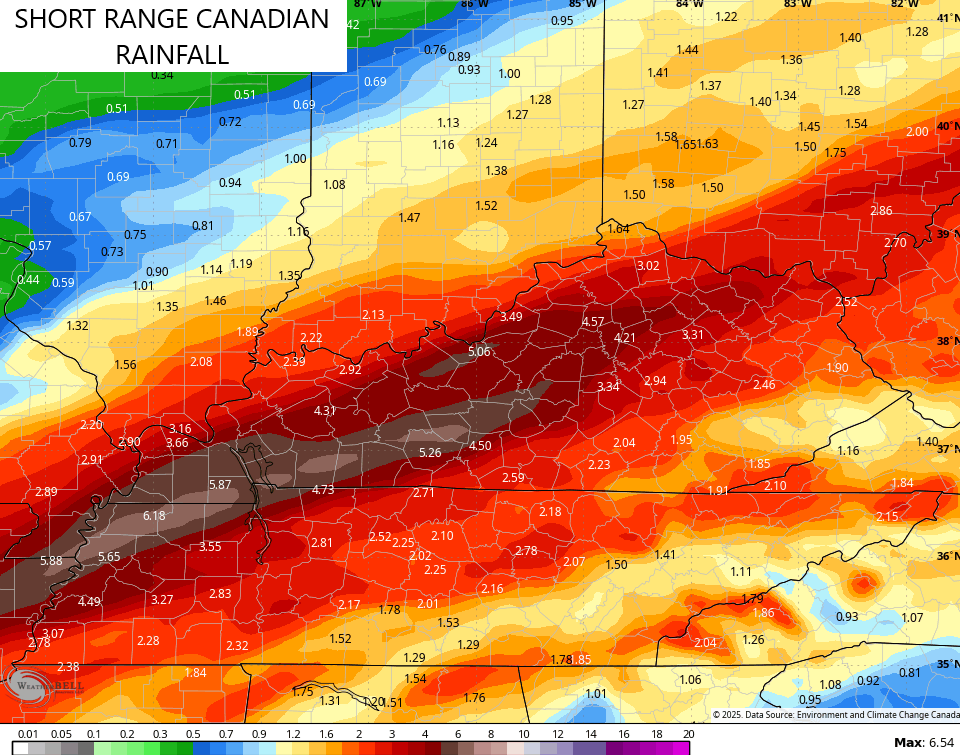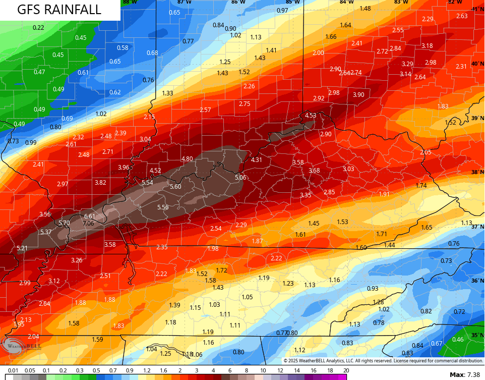 A general 1″-4″ of rain falls across the entire state with a swath of 3″-6″ rains setting up shop within this. Exactly where that is depends on the track of the low and what looks to be showers and storms that “train” from southwest to northeast.