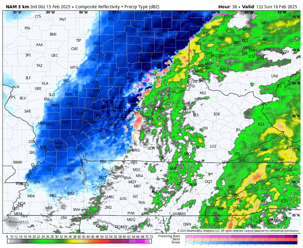 As the cold front crosses the state early Sunday morning, we turn the faucet off as cold winds crash in from the northwest. A period of light snow is likely right behind the front with snow showers kicking in during the afternoon and taking us into Sunday night across central and eastern Kentucky. You can see this all on the Hi Res NAM future radar…