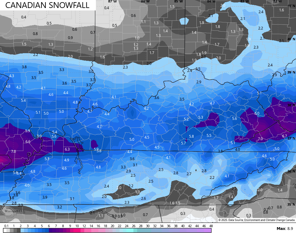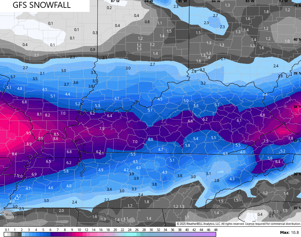 The whole setup still looks to bring the highest snow totals along and south of the Interstate 64 corridor with much lighter amounts in the far north.