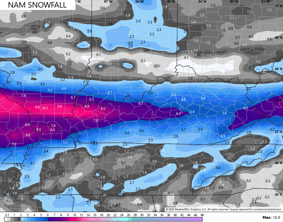 The NAM has way too sharp of a cutoff of the snows in the north and the south…