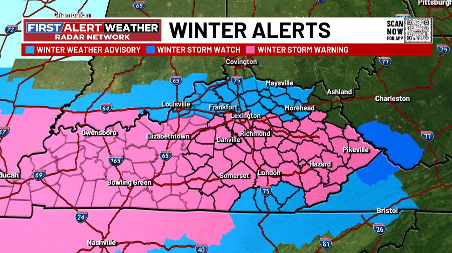 A Winter Storm Warning is out for much of Kentucky with a Winter Weather Advisory in other parts. Here’s a look at what that looks like…