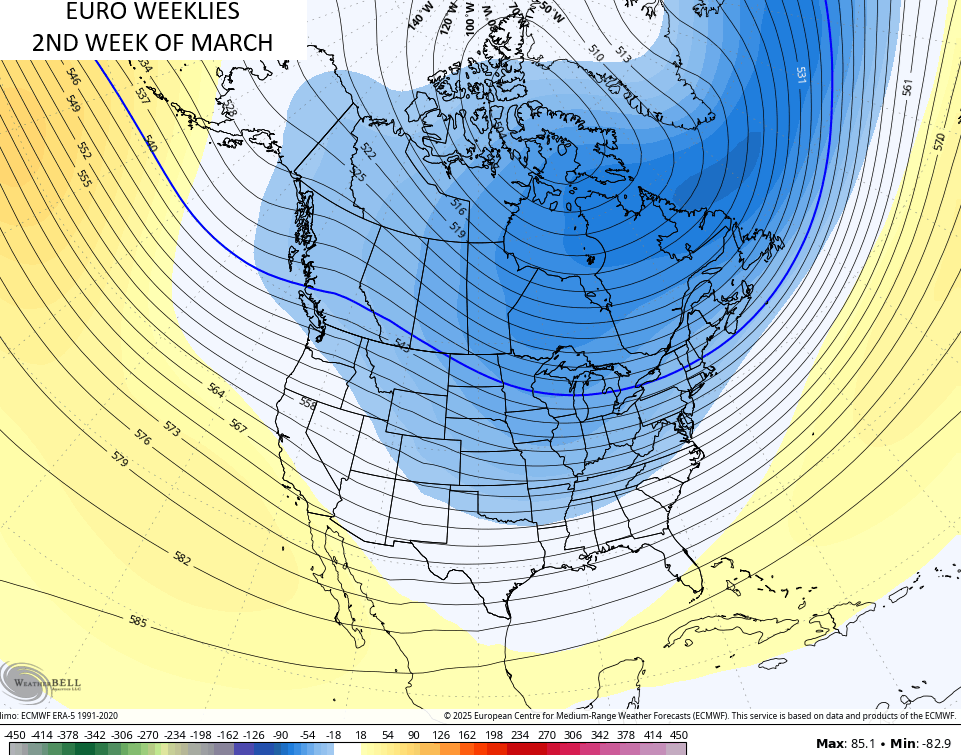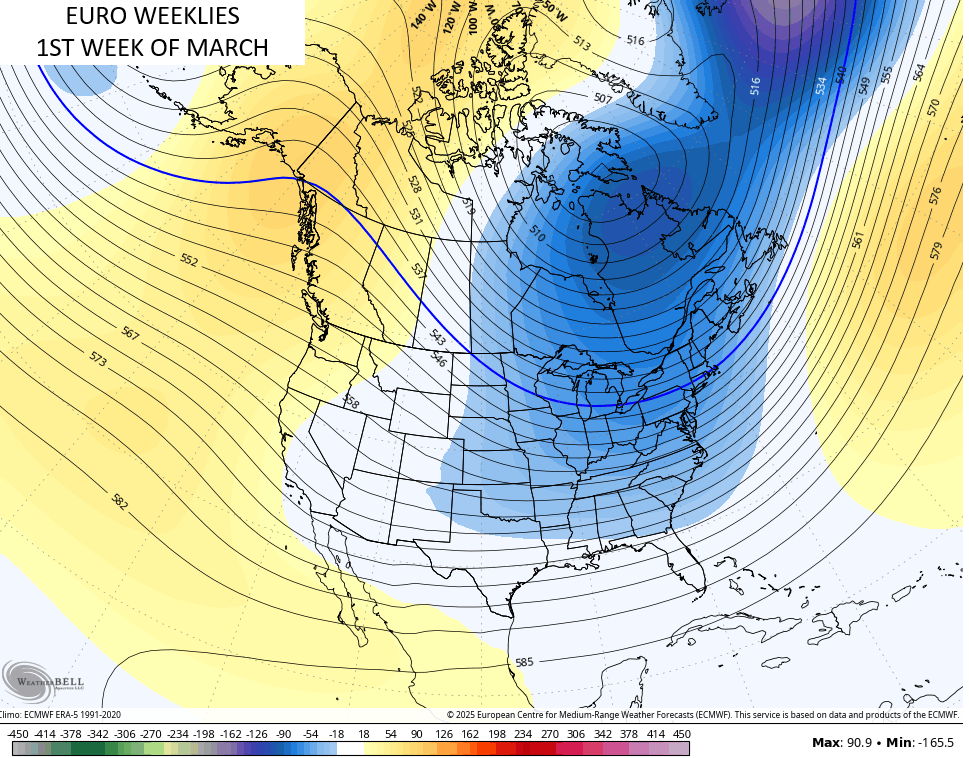 The EURO Weeklies are echoing my concerns for more winter weather for the first half of March as they see that deep trough into the eastern half of the country for the first week of the month…