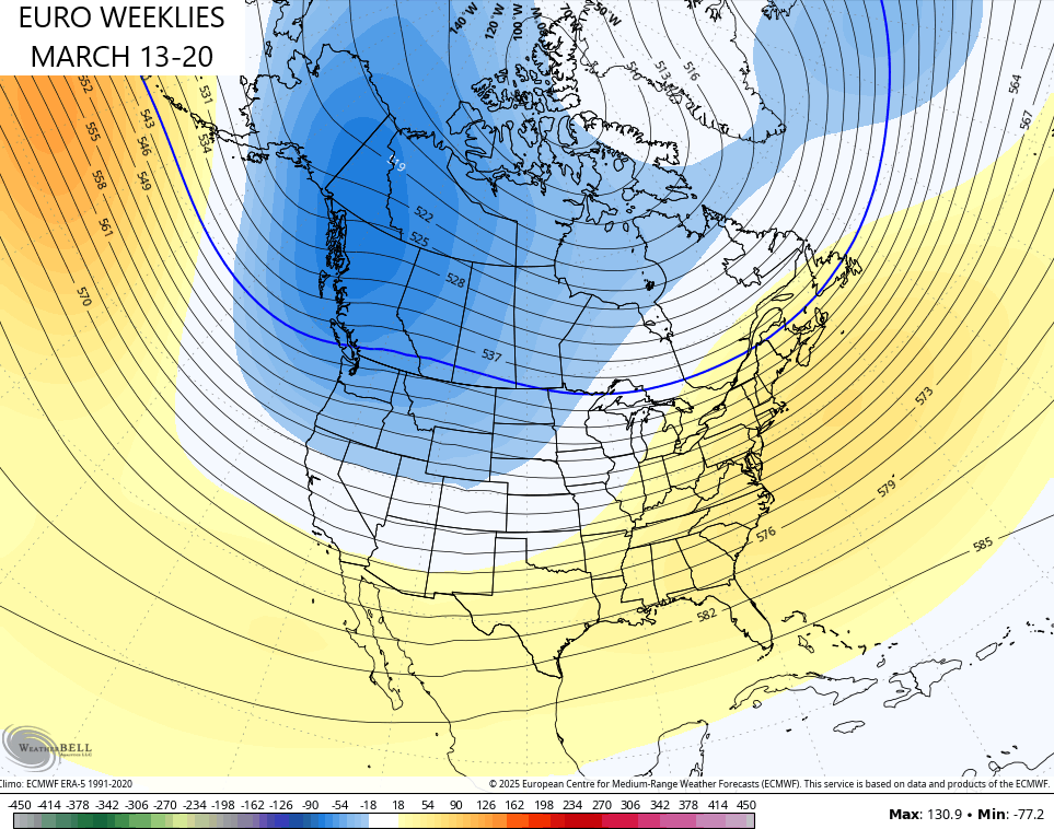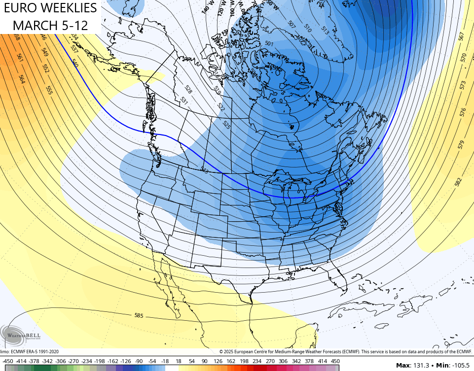 The EURO Weeklies see this winter looking pattern fading during this time. The 7 day height anomalies show that deep trough in the east hanging through March 12th…