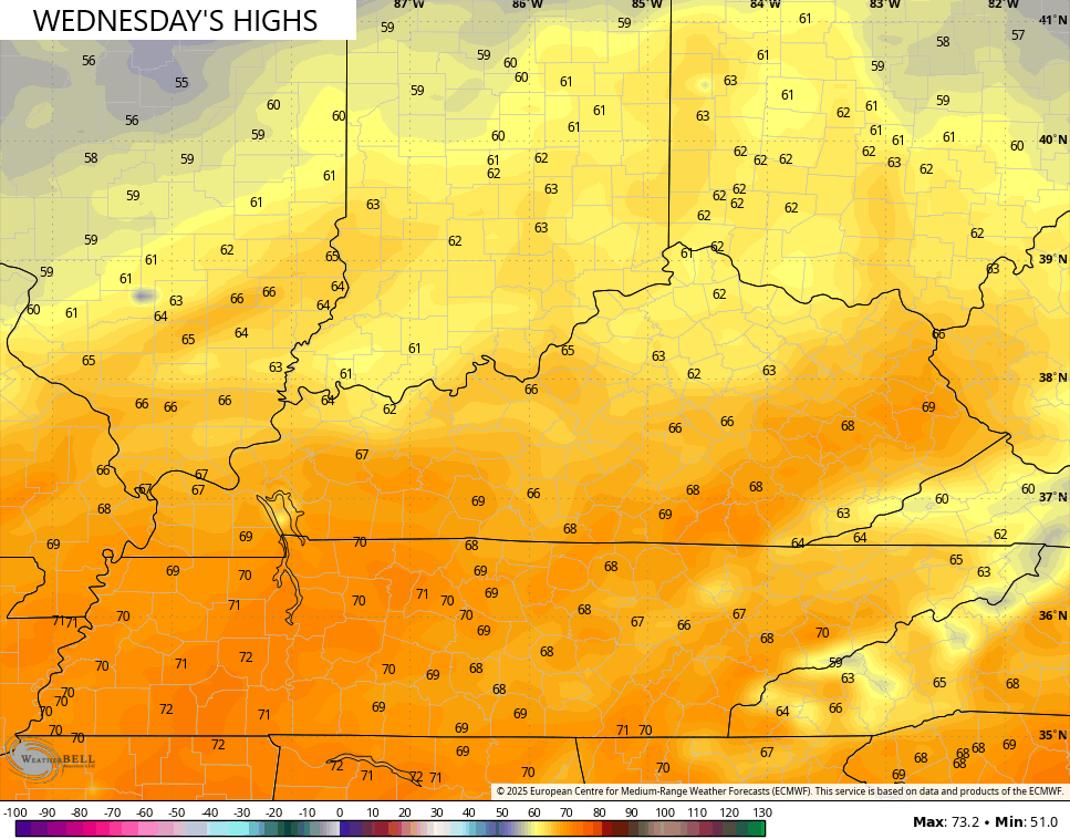 Highs are deep into the 60s for Wednesday with the chance for a 70 in the south and west…