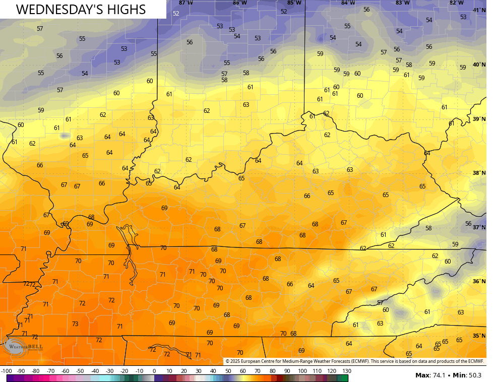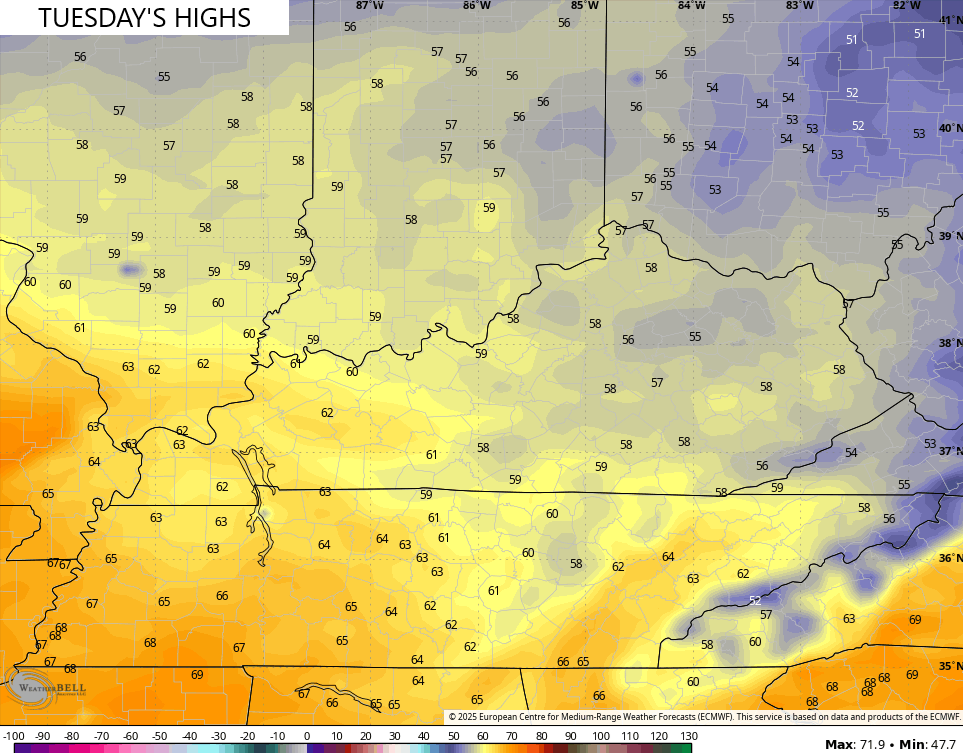 Those mild temps are along and ahead of a cold front dropping in from the northwest. This will bring gusty showers followed by colder air and the chance for a few flakes. Another front drops in behind that this weekend with the chance for some flakes behind it…