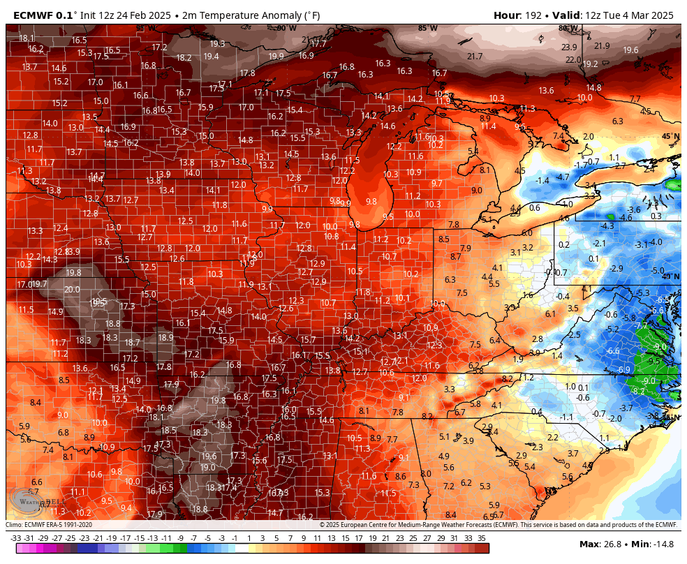 The pattern will really take off in terms of temps for the middle and end of March with above normal temps. Those will likely be accompanied by the threat for strong to severe storms and rounds of heavy rain.