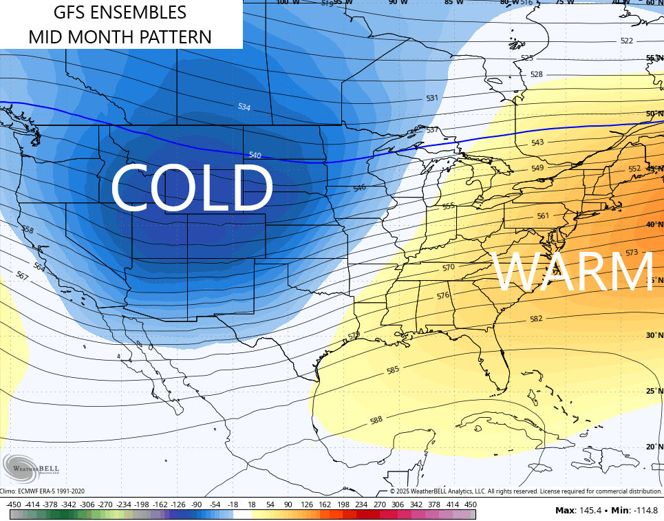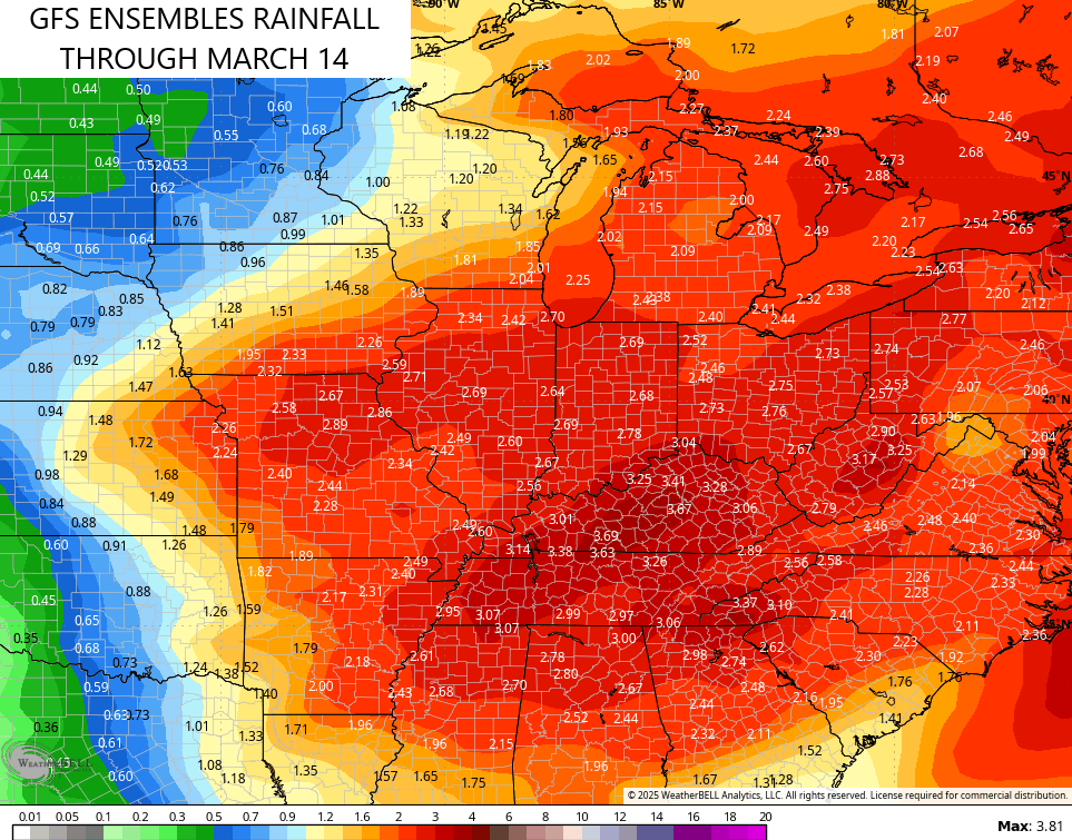 Warmer in the east and cold in the west usually means the battleground sets up in our region. That leads to increased amount of storminess and rainfall and that’s showing up on the same GFS Ensembles through the first 2 weeks of March…