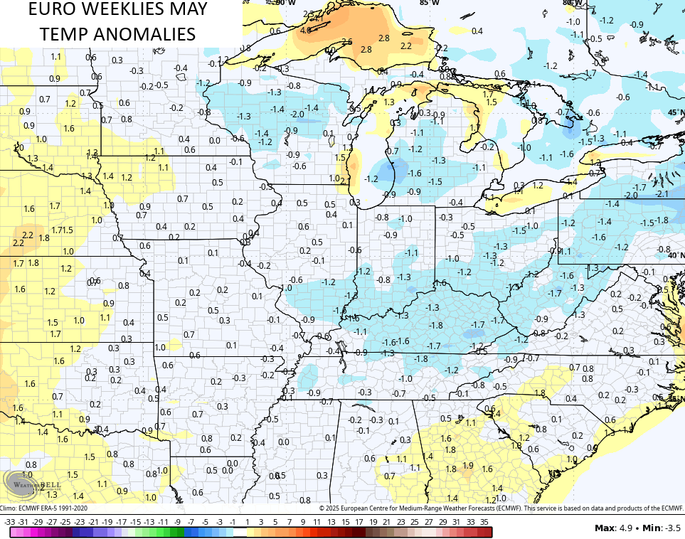 The EURO Weeklies continue to show May with slightly cooler than normal temperatures…