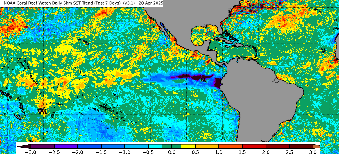Something cool, literally, is happening in the waters of the Equatorial Pacific as the past 7 days have seen a dramatic drop in temps. Look at the blue and Barney colors…