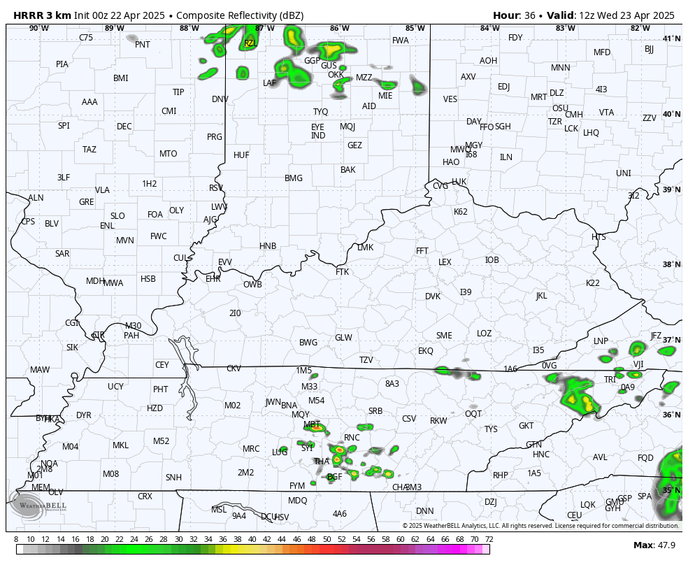 Highs Wednesday reach the upper 70s to low 80s with partly sunny skies. There is enough moisture to spit out isolated showers and storms across the south and southeast. These show up on the future radar from the HRRR…